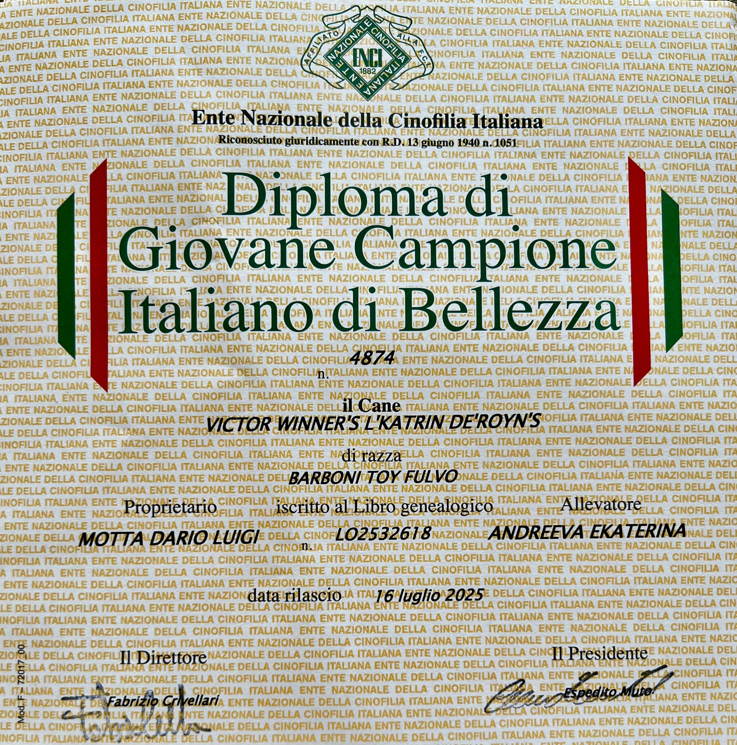 Прекрасная новость в нашем питомнике!!! На одного Чемпиона стало больше!! Теперь у нас есть свой Чемпион Италии! Горжусь замечательным владельцем Виктора -MOTTA DARIO LUIGI и их отличными результатами! Желаю и в будущем больших побед!