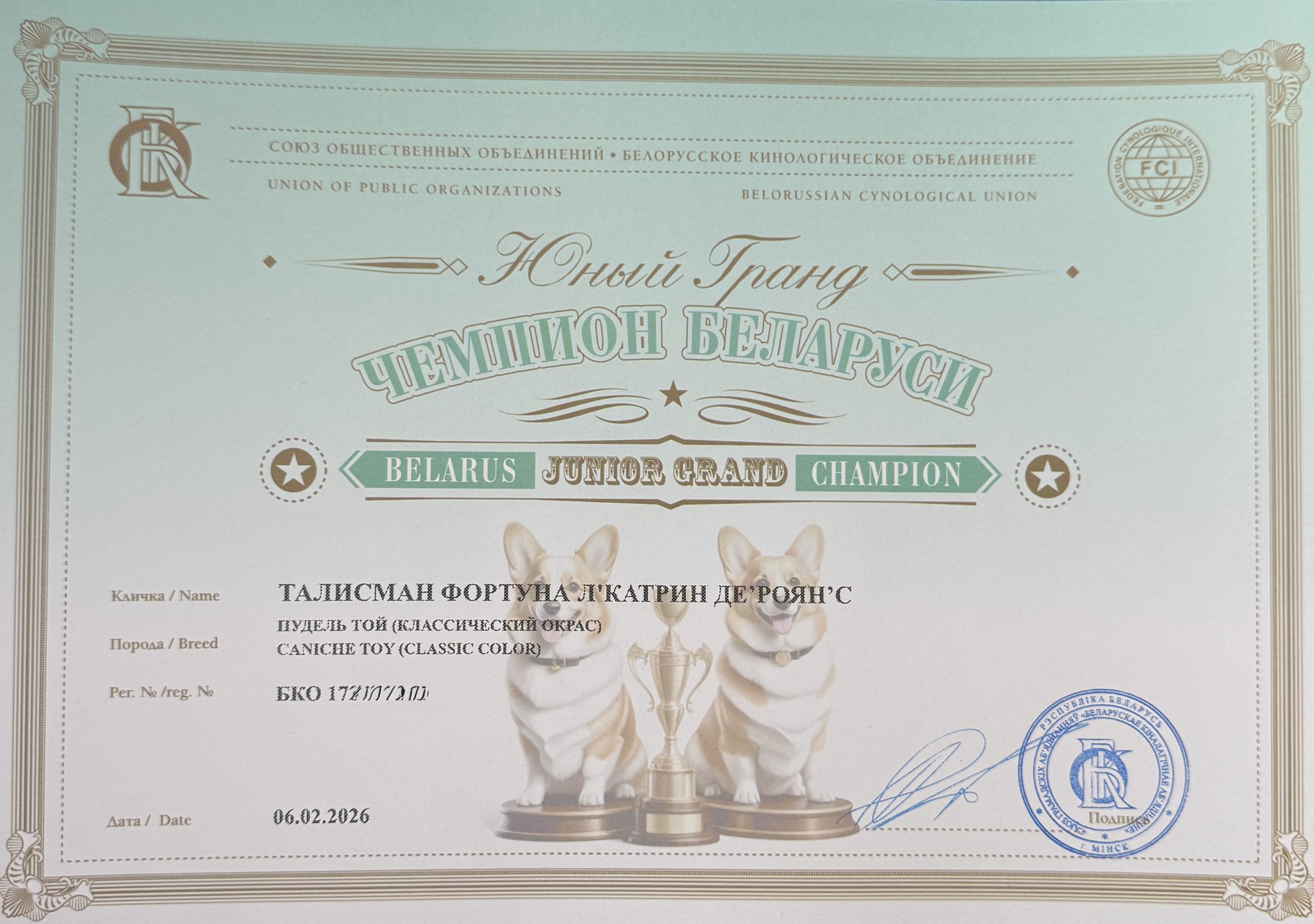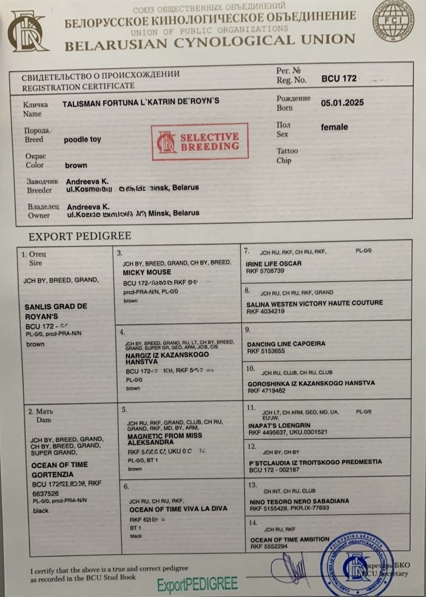 FEMALE TOY POODLE BROWN SALE PUPPY ⭐️Talisman FORTUNA⭐️ ⚜️L’Katrin De RoYn’s⚜️ 05.01.2025Selective breeding ‼️female poodle Toy 27 смbrownFCI PRA N/NPatella 0/0 BELARUS JUNIOR CHAMPION; BELARUS JUNIOR BREED CHAMPION; BELARUS JUNIOR GRAND CHAMPION; CIS JUNIOR WINNER- ПОБЕДИТЕЛЬ СНГ -2026!🌏www.poodle.byS: 🤎SANLIS GRAD DE ROYN’S 🤎 (Mike Mause ( коричневый) & Nargiz iz Kazanskogo Xanstva (коричневая)). 29 смM: 🖤 Ocean Of Time Gortenziya 🖤 ( Magnetic From Miss Aleksandra ( коричневый) & Ocean of Time Viva La Diva ( чёрная)). 27 см Talisman FORTUNA L’KATRIN DE ROYN’S BEST PUPPY -I 3 августа 2025Чемпионат по породе пудель(КОО)№ 23. класс щенки: бол пер. CW, ЛЩЛучший щенок / Best puppy — 1 местоСудья: GINDULLINA ELENA (Russia) 3 августа 2025Республиканская выставка компаньонов и тоев(ОО ЭЛИТА) ⭐️Talisman FORTUNA⭐️ 6 months ⚜️L’Katrin De RoYn’s⚜️Республиканская выставка компаньонов и тоев(ОО ЭЛИТА)№ 67. щенки бол пер.CW, ЛЩЛучший щенок / Best puppy — 3 место. судья: SEDYKH NIKOLAY (Russia) Республиканская выставка компаньонов и тоев (ОООДЖ «БЭСТ»). 24.05.25 ТАЛИСМАН ФОРТУНА Л’КАТРИН ДЕ’РОЯН’С№ 56 бэби бол пер.CW, ЛБЛучший беби / Best baby — 2 место